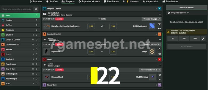 O II22 oferece uma grande seleção de opções de apostas em e-sports com probabilidades competitivas